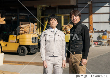 フォークリフトの前に立つ2人の作業員
