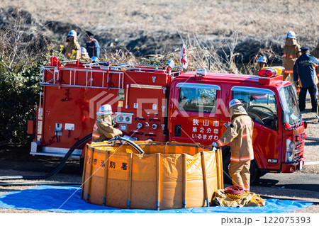 出初式で消火活動の実演を披露するために消防車の横で出動準備をする消防隊員