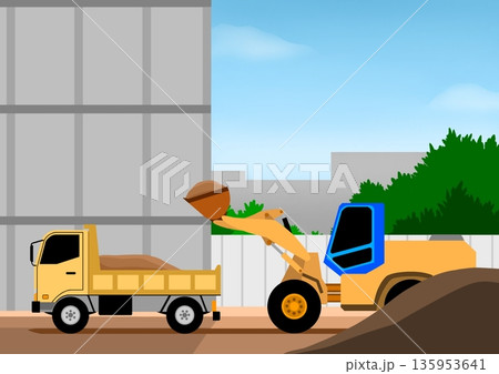 建設現場で輝く黄色いブルドーザーとトラクターシャベルが力強さと成長を感じる