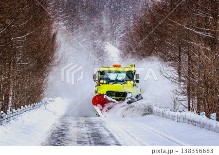 雪を吹き飛ばす除雪作業、迫力ある冬のワンシーン