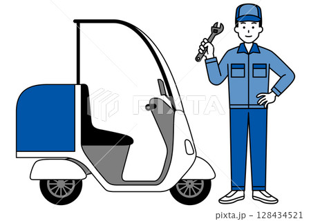 ポストの前に立つ笑顔の郵便配達員とバイクのイメージイラスト