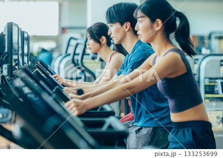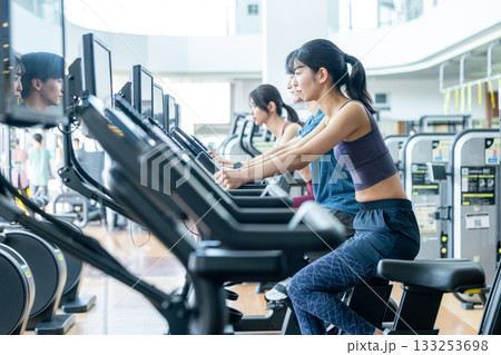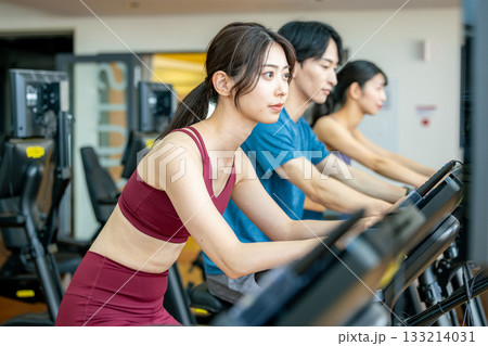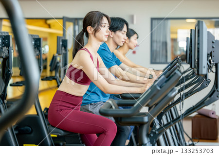 スポーツジムでアップライトバイクを使う男女