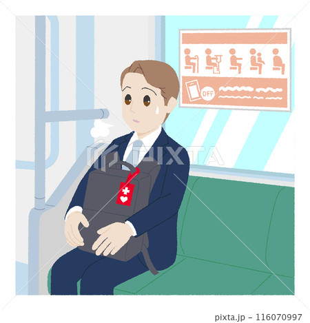 シンプルなタッチのヘルプマークを付けた優先席に座る男性