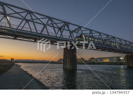 夕暮れ時に多摩川にかかった橋を颯爽と走り抜ける京王線の電車の写真