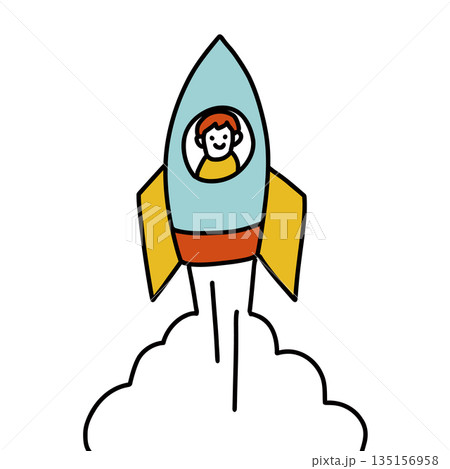 ロケットに乗って上昇する子供のイラスト 成長・育成・活躍・やる気コンセプト