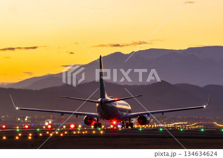 夕暮れの仙台空港 タキシング中の飛行機 宮城県名取市