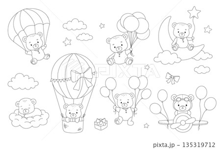 Cute bear in hot air balloon, with balloons, moon, airplane, line hand drawn illustrations set isolated on white background