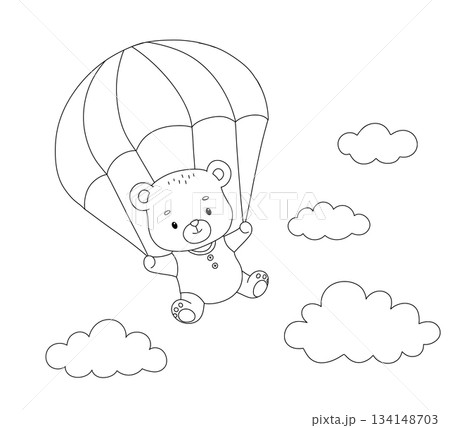 Cute bear with parachute, line hand drawn illustration isolated on white background for coloring book