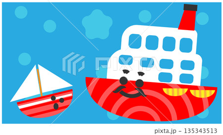 昼の海を進むかわいい船のキャラクターたちのイラスト背景
