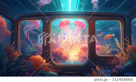 サンゴ礁の海中を進む潜水艦と光が差し込む神秘的な水中風景