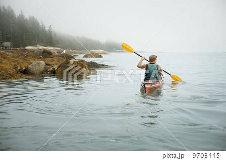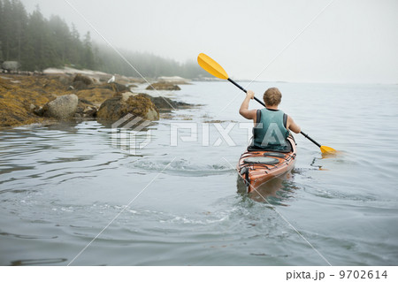 A man paddling a kayak on calm water in misty conditions. New York State, USA