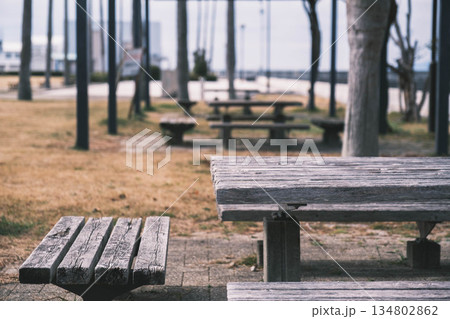 [和歌山マリーナシティ]使い古された木製の机と椅子