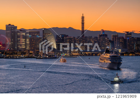 《神奈川県》横浜みなとみらいの夜景と出港する豪華客船