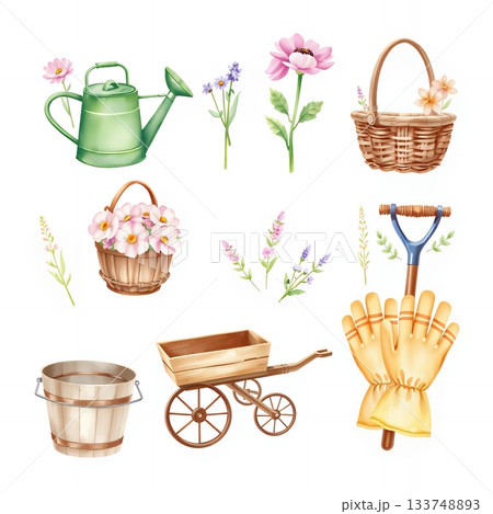 水彩ガーデニング道具と花かごクリップアートセット