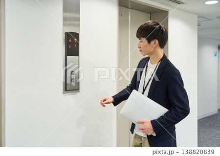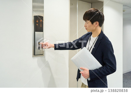 ノートパソコンを持ちエレベーターを待つ若いビジネスマン