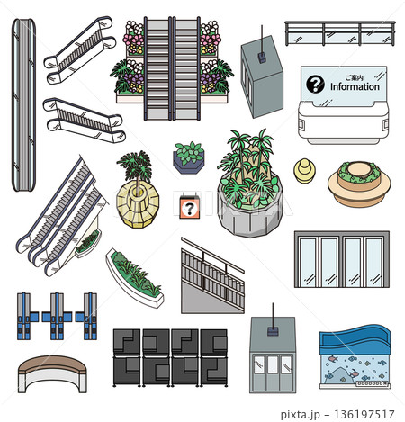 アイソメトリックな公共施設・商業施設の設備セット・ベクターイラスト素材