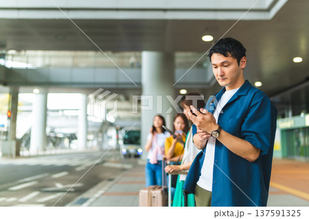 旅先でタクシー(バス)を待つ人たち 「撮影協力:関西国際空港(KIX)」