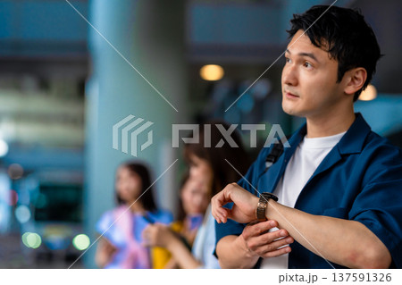 駅で時間を確認する男性 ■撮影協力:関西国際空港(KIX)