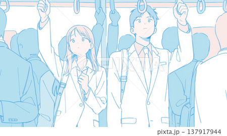 電車内で立つ外出前の女性のイラスト_日常の移動シーン