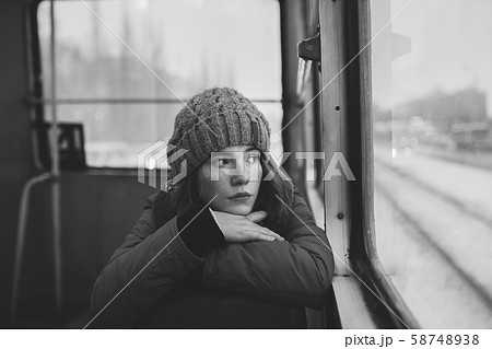 A woman sitting at a window seat in a train carriage, resting her head on her hand. Looking into the distance.
