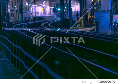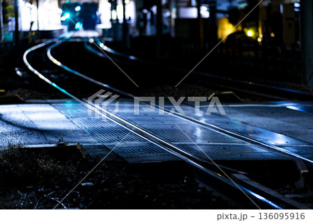 夜の警報器が光る踏切りを通過してゆく列車のイメージ
