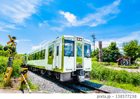 桜を背景に遮断機の無い小さな踏切を渡った由利高原鉄道の単行気動車