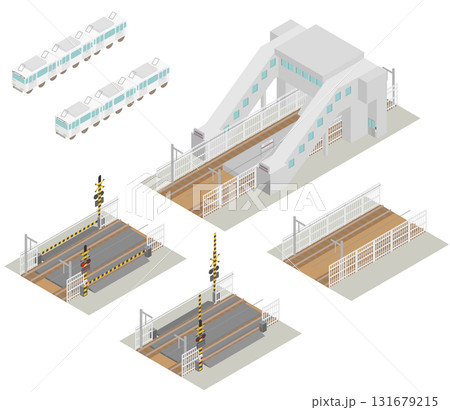 日本の駅舎をイメージした線路や踏切や鉄道のアイソメトリック素材セット