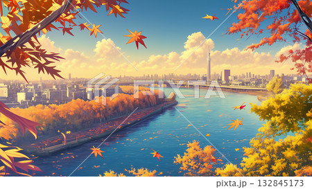 沈む夕日と大都市を流れる川の風景、アニメ風