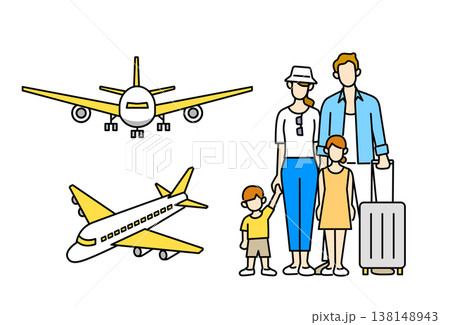 飛行機と旅行に行く家族