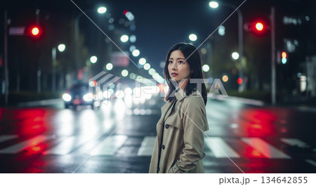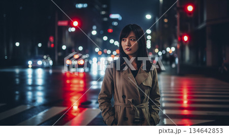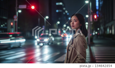 夜の街を歩く女性のポートレート|都会に映える洗練されたライフスタイルの一瞬