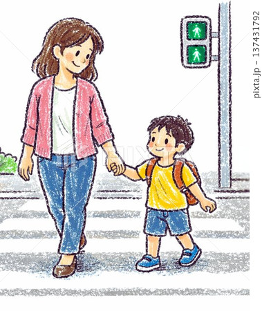 横断歩道で手をつないで歩く親子の交通安全イメージ