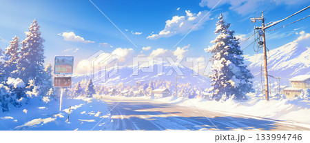 青空と積乱雲と田舎のアスファルトの道の風景、アニメ風