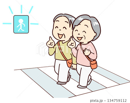 元気に出かける高齢者、横断歩道を青信号のうちに渡りきる