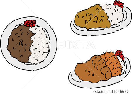カレーのアイコンイラスト。カツカレー。ナンやスパイスのインドカレー。