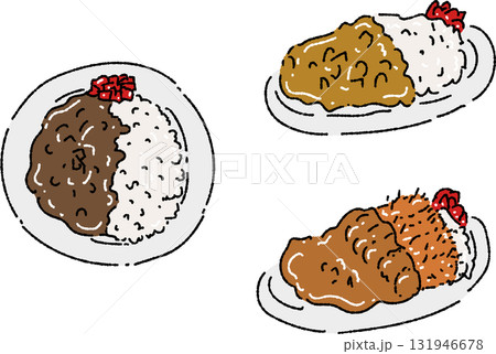 カレーライスとカレーの材料の手描きイラストセット(カラー)