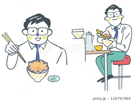 いただきます 牛丼屋さんでおいしそうに牛丼を食べるビジネスパーソン セットのストックイラスト素材