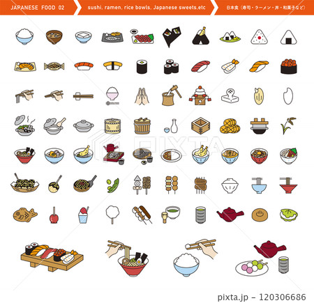 日本食のアイコンセット。寿司やラーメンなどのベクターイラスト。和食の素材。