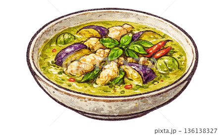 白い器に盛られたグリーンカレーの水彩風イラスト