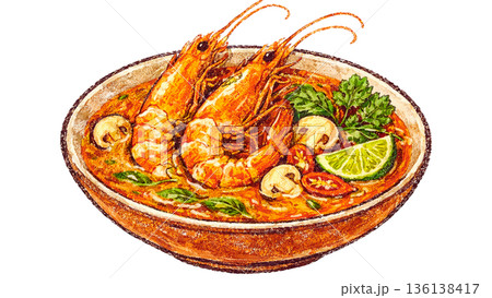 大きな海老が入ったスパイシーなトムヤムクンのシズル感溢れるテクスチャ