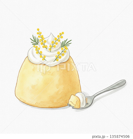 ミモザシリーズ:ミモザの花を飾ったふわふわシフォンケーキのイラスト