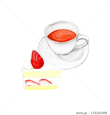手描き水彩の紅茶カップといちごショートケーキのイラスト ティータイム おしゃれスイーツ