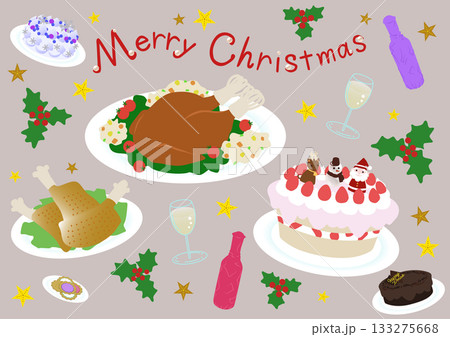 クリスマスケーキとごちそうで楽しいパーティー クリスマスイラスト