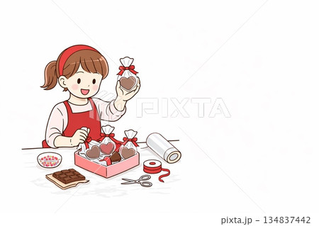 女の子がお菓子をラッピングしているイラスト