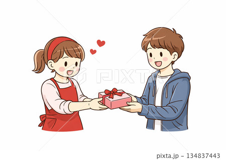 女の子が男の子にお菓子をプレゼントしているイラスト