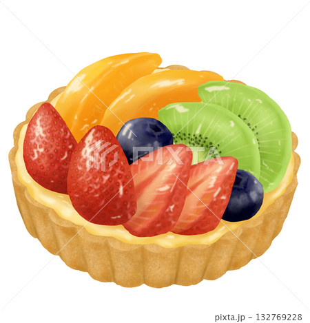 カラフルな苺、キウイ、黄桃、ブルーベリーのフルーツタルトイラスト