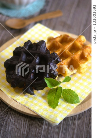 おやつのプレーンワッフルとチョコワッフル (写真素材)
