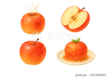 手描き水彩の美味しそうなアップルパイとりんごのイラストセット