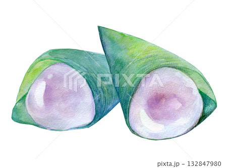 桜の葉に包まれた桜餅の水彩イラスト(食品・食材)