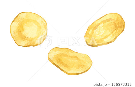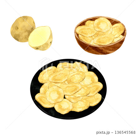 ポテトチップスとじゃがいものセット 料理・食べ物の手描き水彩イラスト素材