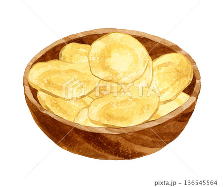 木製の器に盛り付けたポテトチップス 料理・食べ物の手描き水彩イラスト素材